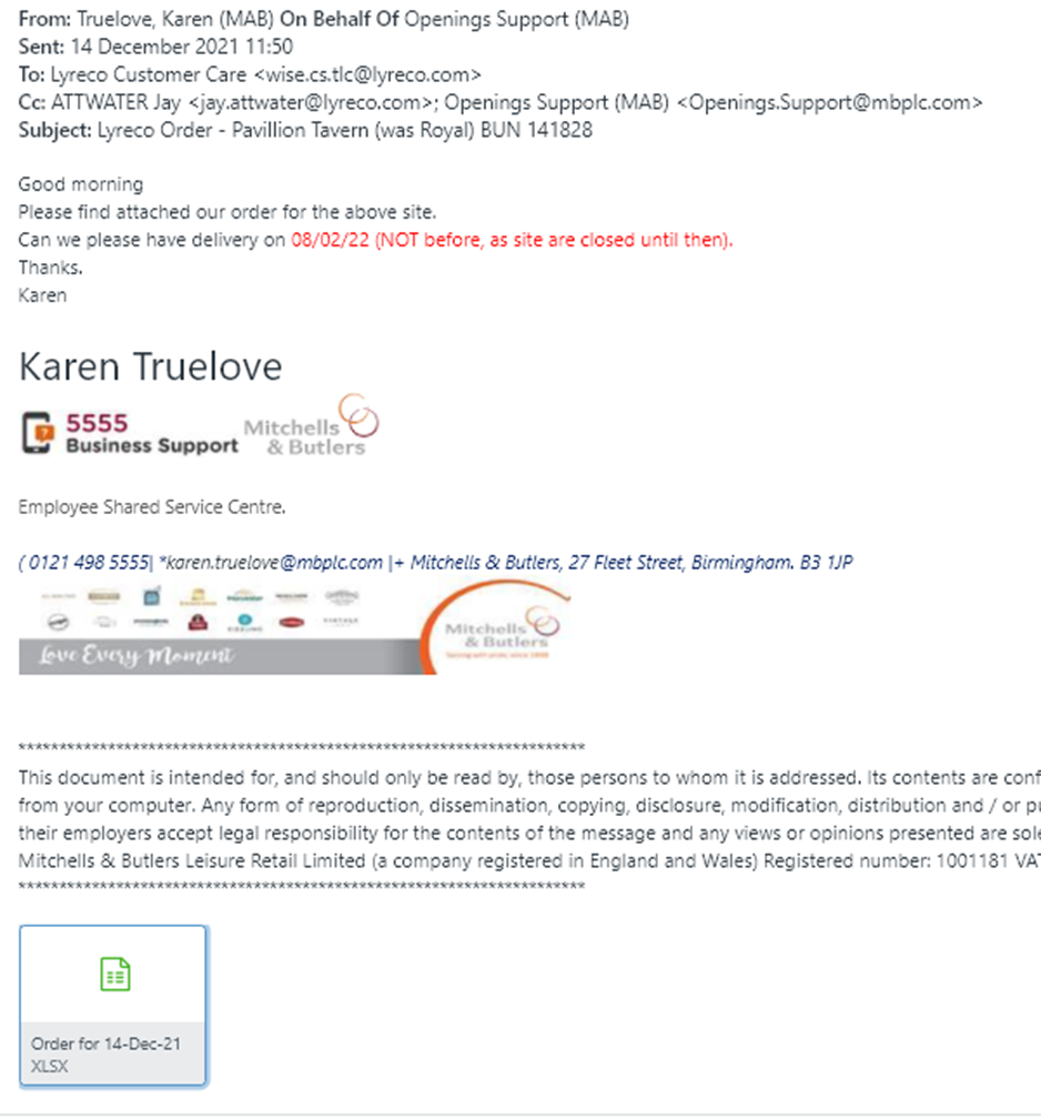 This account is for non-EDI orders only. Orders are to be placed by e-mail and can only be processed with a valid purchase order number (PO). PO numbers are 8 digits long, without any breaks or dashes, and will begin with 1, 3 or 5. No telephone orders to be accepted. Orders from the customers pubs and restaurants must be placed via Trade Simple. If they should have any queries, please ask them to contact their Business Support team. The PO number must be used as the order reference and appear on the invoice’.